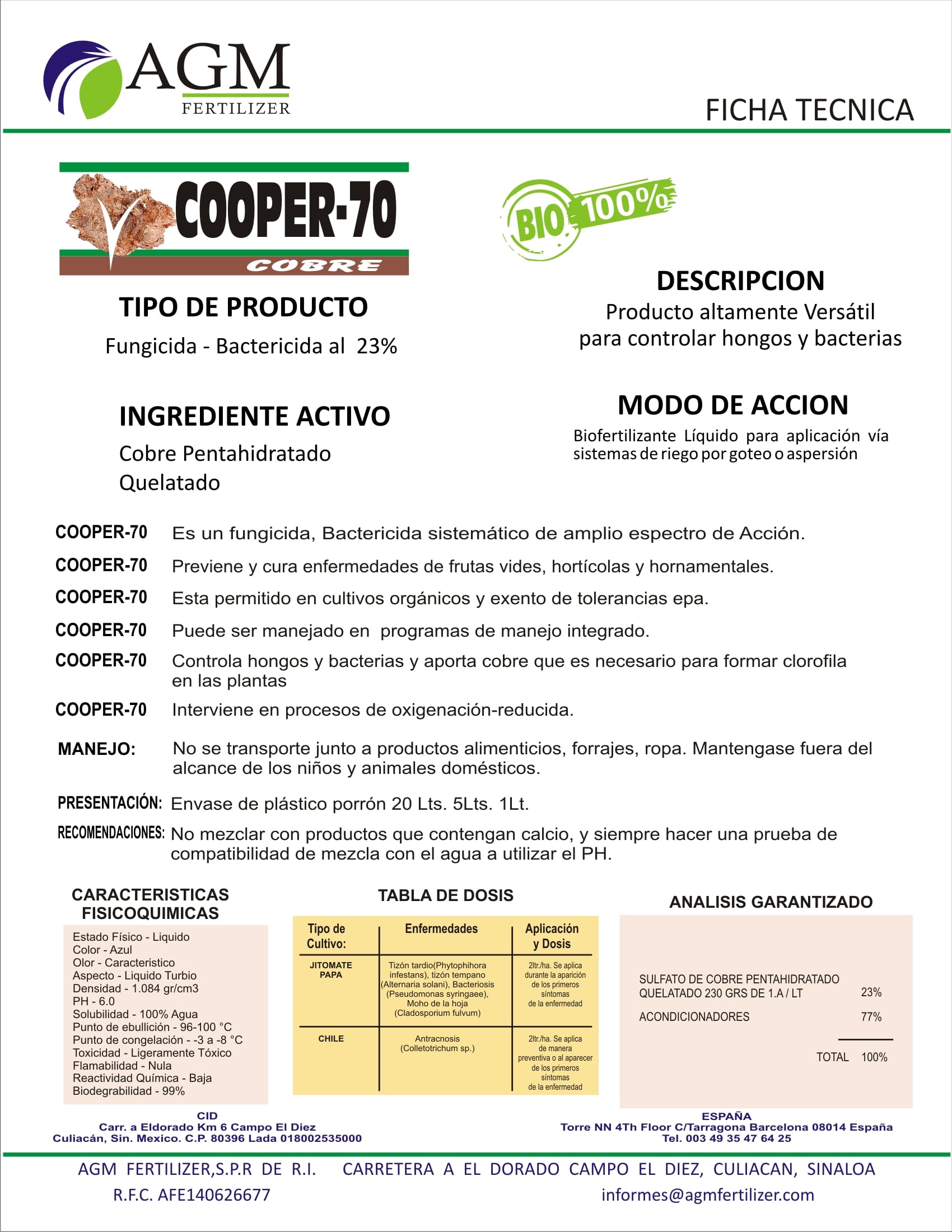 Es un fungicida, Bactericida sistemático de amplio espectro de Acción. Previene y cura enfermedades de frutas vides, hortícolas y hornamentales. Esta permitido en cultivos orgánicos y exento de tolerancias epa.