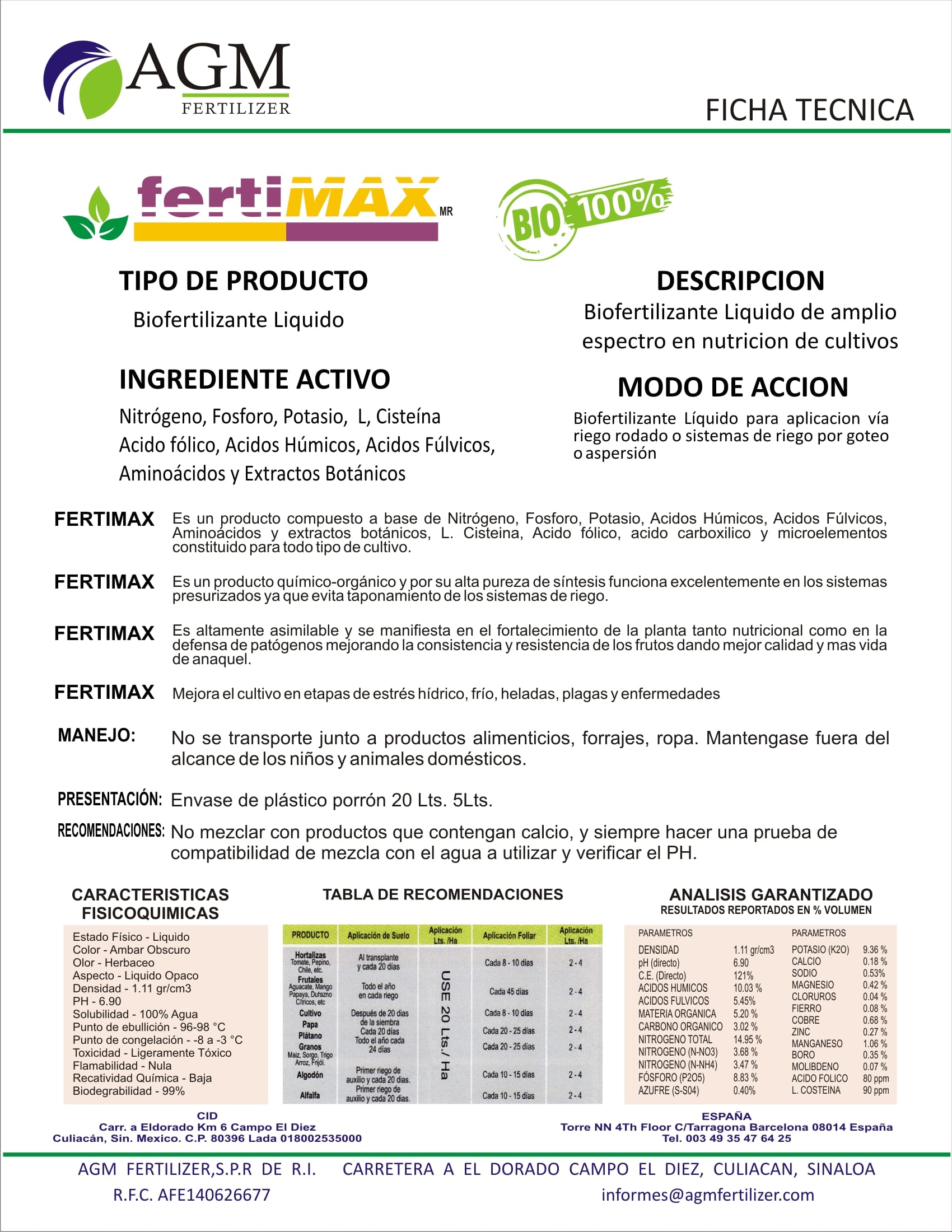 Es un producto compuesto a base de Nitrógeno, Fosforo, Potasio, Ácidos Húmicos, Ácidos Fúlvicos, Aminoácidos y extractos botánicos, L. Cisteína, Ácido fólico, Ácido carboxílico y microelementos constituido para todo tipo de cultivo.