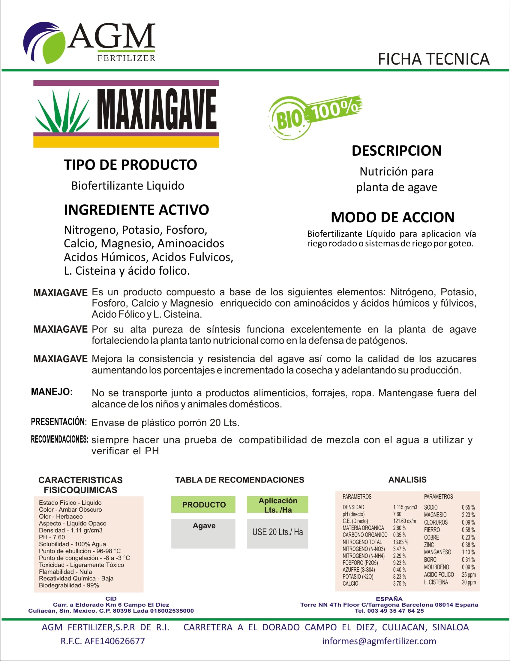 Mejora la consistencia y resistencia del agave así como la calidad de los azúcares aumentando los porcentajes e incrementado la cosecha y adelantando su producción.